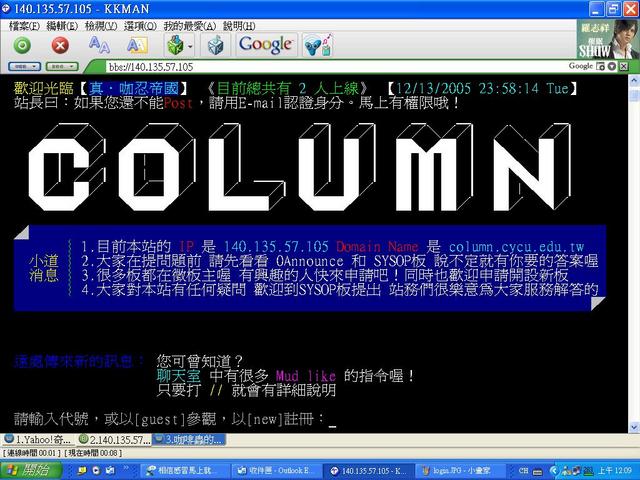 熟悉BBS的人,對下面的畫面不陌生吧!這是陪伴我們念研究所的一個化學系地下站,學弟們為了做實驗通column(喀忍),又加上個人的興趣所架的一個站,經過很多風波,當我也從博士班畢業時將站寄放在NMR室,最後被偷,pipet學弟重新燃起希望再寄放到我們老師的辦公室,最慢也是明年暑假需要做一個站的存亡抉擇。前一陣子雖然忙碌,但是卻連不上喀忍,心裡就覺得毛毛的!